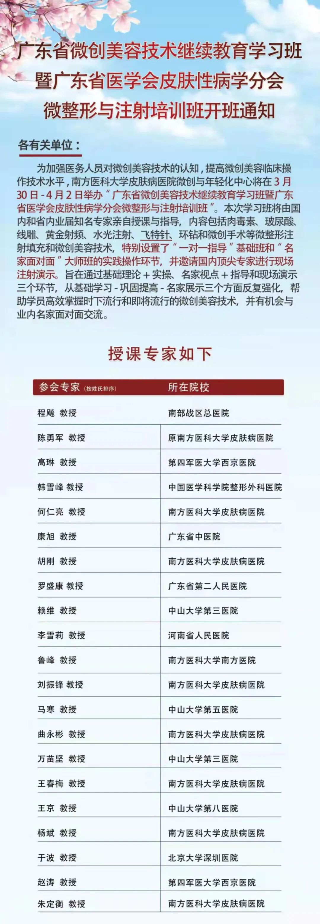 3月30日-4月2日,广东省微创美容技术继续教育学习班暨广东省医学会皮肤性病学分会微整形与注射培训班(下称“培训班”)将在南方医科大学隆重举办。