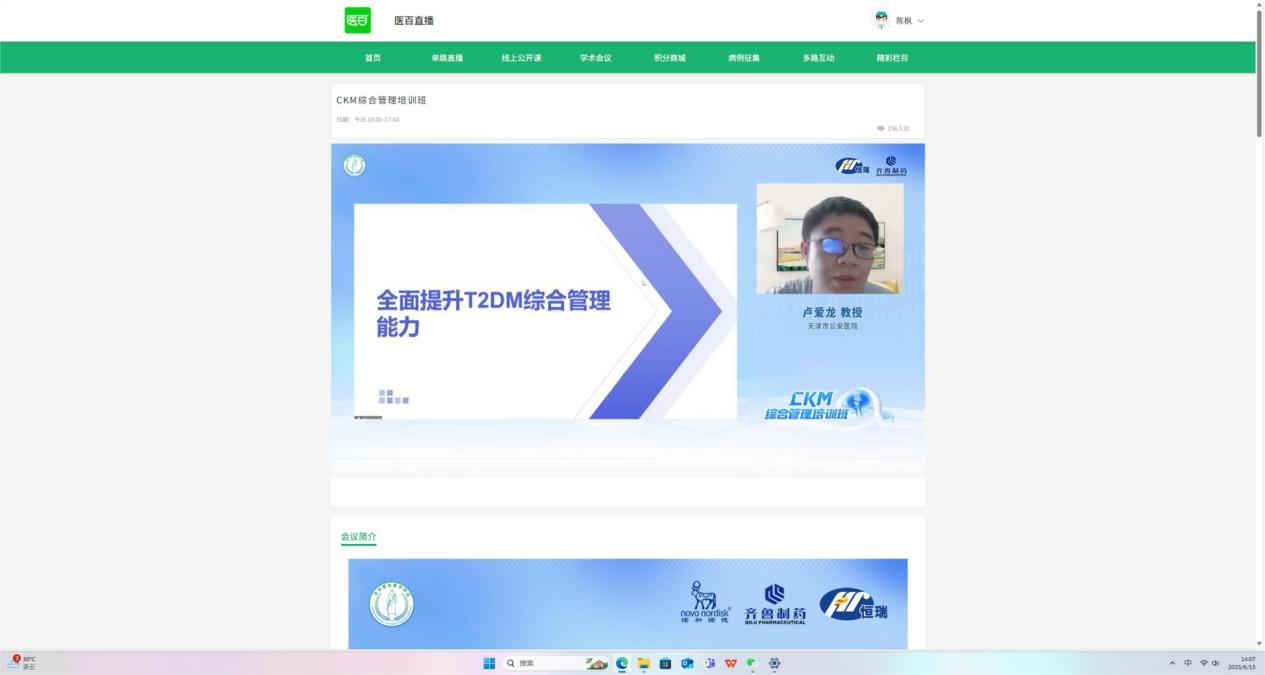 (本报讯) 2025年6月15日,以"糖尿病综合管理及共病诊疗策略"为主题的CKM综合管理培训班在线上平台成功举办。本次会议特邀国内内分泌领域知名专家,围绕糖尿病诊疗新进展、指南更新要点及临床实践难点等核心议题展开深入探讨。来自全国各地的60余位临床医师、药学专家及基层医疗工作者在线参与,共同就糖尿病全程化管理的新理念、新策略进行了全面交流。