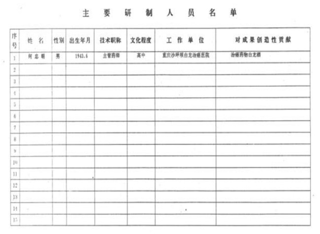 1993年重庆市卫生局重卫药【1993】第054号文批准何忠明发明的治癌药物白龙酒进入中国第三军医大学西南医院、新桥医院、大坪医院临床试验。