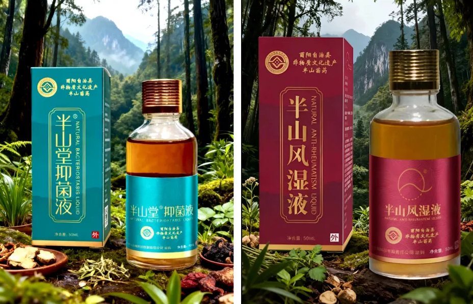 (图为:半山苗药核心产品——绿色包装半山堂抑菌液、红色包装半山风湿液)